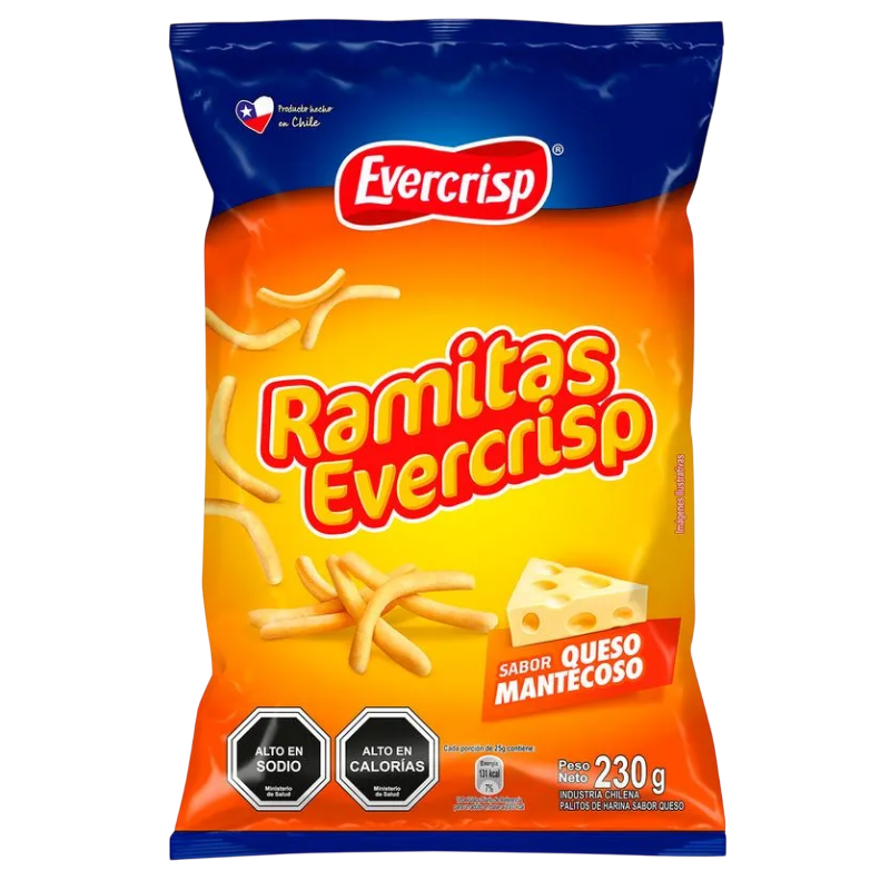 Las Ramitas Evercrisp sabor Queso en su presentación de 230 gramos ofrecen una irresistible combinación de crocancia y un sabroso toque a queso que encanta a grandes y chicos. Ideales para tus momentos de picoteo, fiestas o una pausa sabrosa durante el día. ¡Un clásico chileno con todo el sabor del queso!