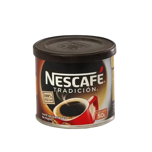 Tarro Nescafé Tradición instantáneo en polvo de 50 gramos, sabor intenso y aroma inconfundible.